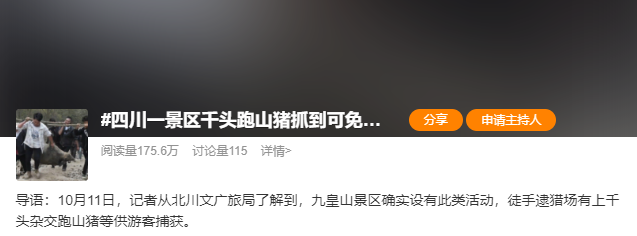 游客在景区猎场徒手抓“野猪”“野兔”“山鸡”,抓到还可以带走。近日,四川绵阳市北川羌族自治县一景区“徒手逮猎”旅游项目在网络上受关注,引发质疑。