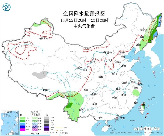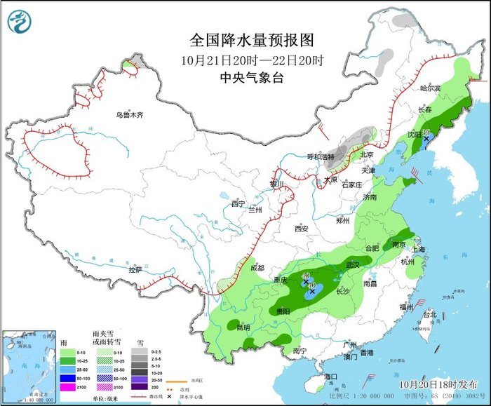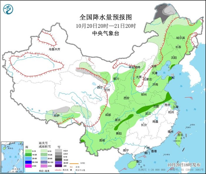 10月20日20时至21日20时,内蒙古中东部、黑龙江西北部、西藏东北部和南部、甘肃河西等地部分地区有小雪或雨夹雪,其中,内蒙古东北部、黑龙江西北部等地部分地区有中到大雪。内蒙古东南部、东北地区大部、西北地区东部、华北中西部、黄淮、江淮大部、江汉、西南地区大部、广西西北部、海南岛、台湾岛等地部分地区有小到中雨,其中,山东半岛等地部分地区有大雨(25毫米)。内蒙古西北部部分地区有5~6级风(见图1)。
