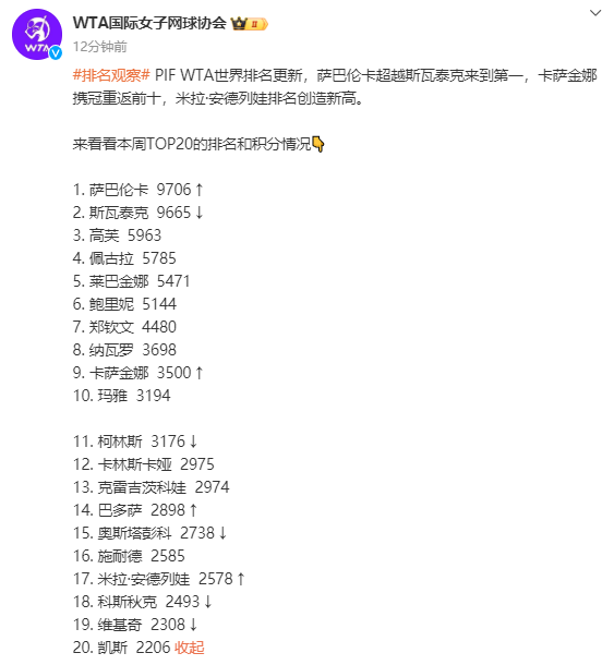 10月21日,WTA官方更新最新一期世界排名。由于斯瓦泰克连续退赛持续扣分,萨巴伦卡凭借“中国赛季”的强势发挥,终于重返世界第一。