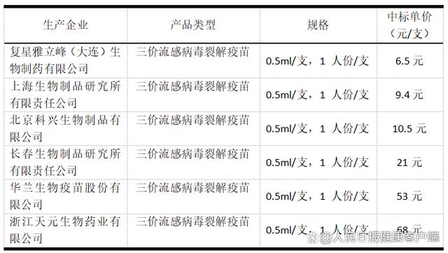 人民日报健康客户端记者不完全统计,截至2024年10月20日,部分相同规格三价流感疫苗的最低中标价格。