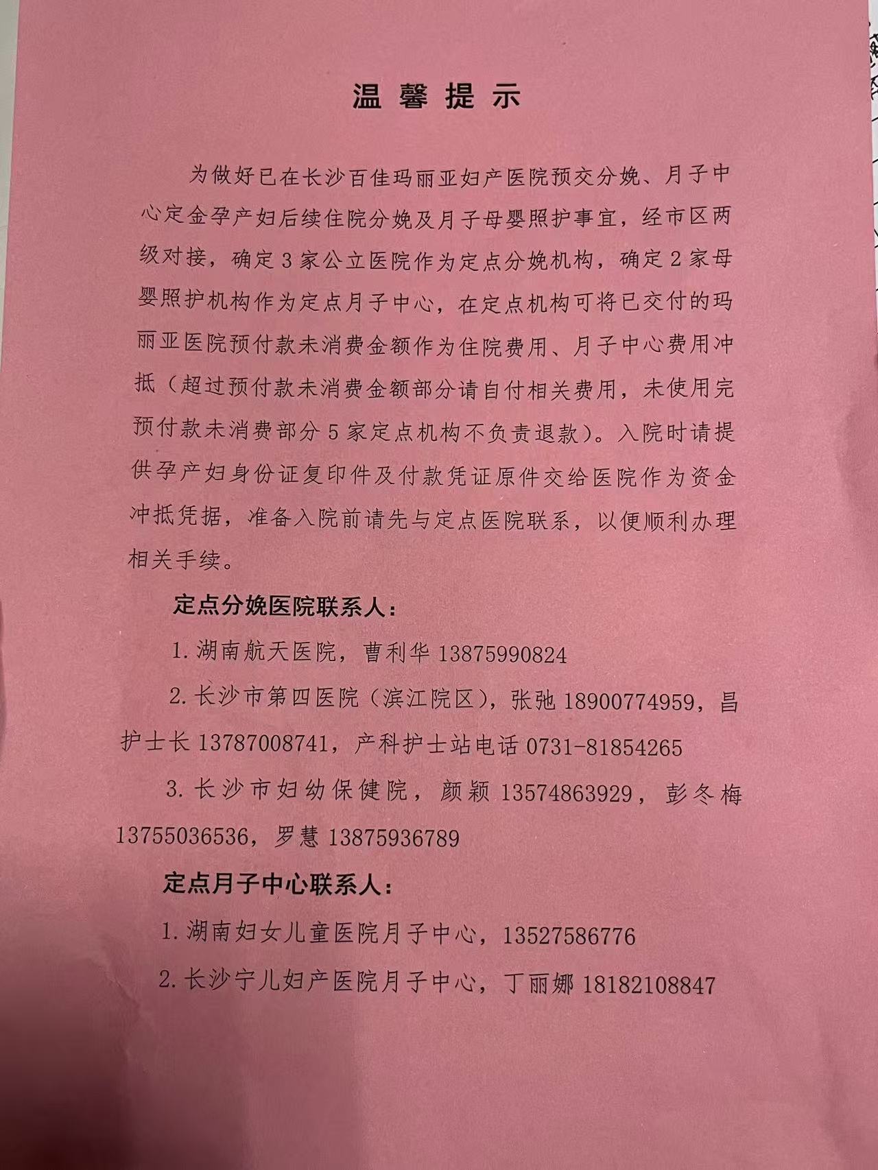 目前已确定3家公立医院(湖南航天医院、长沙市第四医院滨江院区、长沙市妇幼保健院)作为定点分娩机构,确定2家母婴照护机构(湖南妇女儿童医院月子中心、长沙宁儿妇产医院月子中心)为定点月子中心。在定点机构可将交付的玛丽亚医院预付款未消费金额作为住院费用、月子中心费用冲抵。