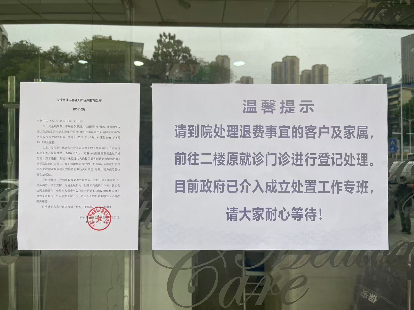 医院入口处张贴有“长沙百佳玛丽亚妇产医院有限公司停业公告”。公告显示“由于资金链断裂、市场竞争激烈,为规避医疗风险,确保母婴安全……经向长沙市卫健委报备,决定于2024年10月19日至2025年4月19日停业重整”。