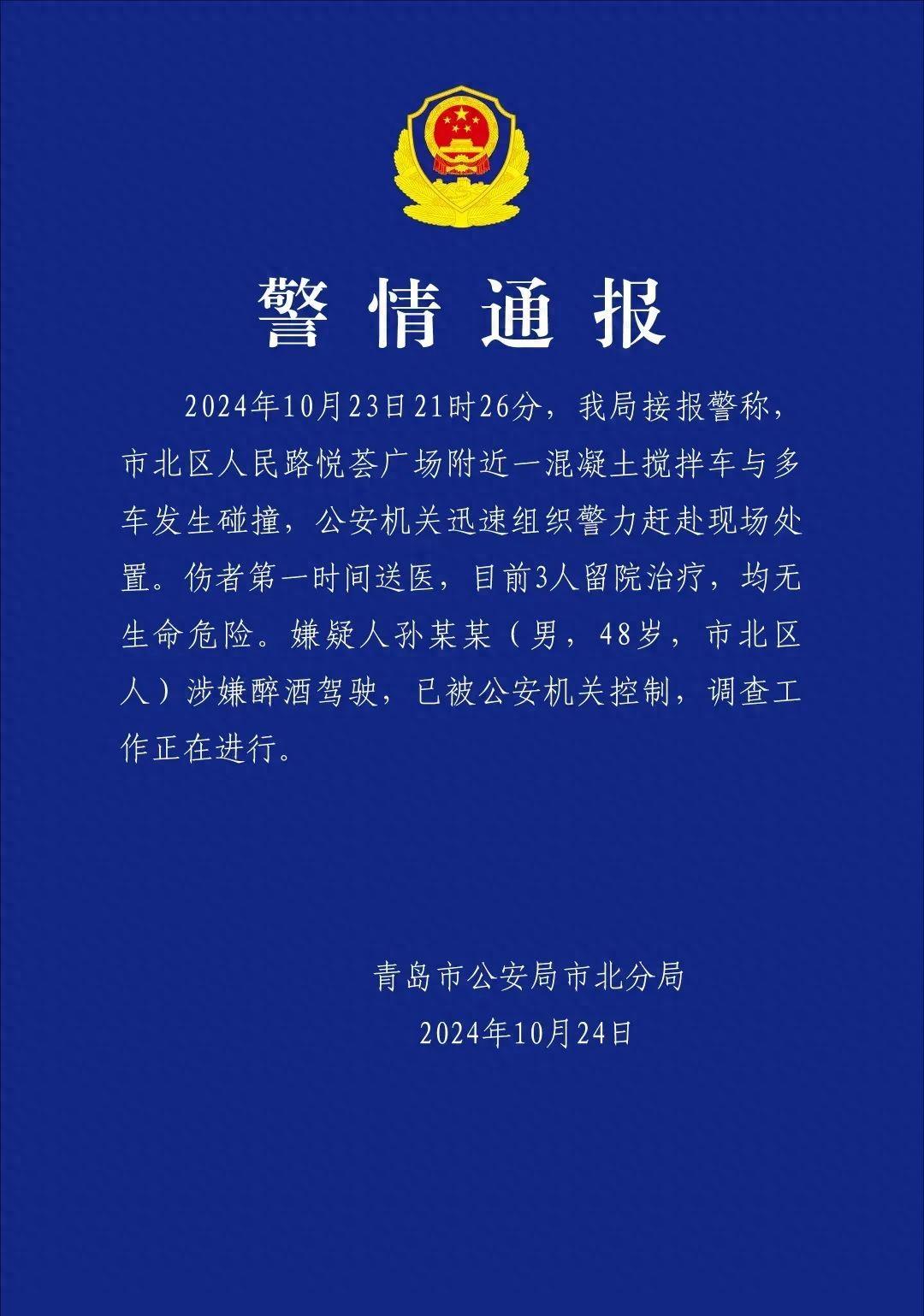 10月24日,山东青岛市公安局市北分局就青岛悦荟广场附近一混凝土搅拌车与多车发生碰撞,发布警情通报。通报全文如下: