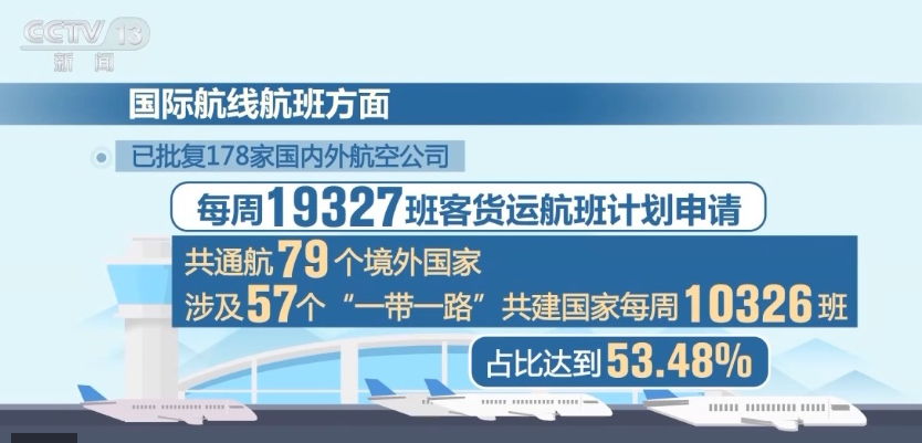 国际航线航班方面,已批复178家国内外航空公司的每周19327班客货运航班计划申请,共通航79个境外国家,涉及57个“一带一路”共建国家每周10326班,占比达到53.48%。