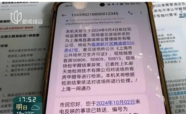 袁女士向12345热线反映,得知9月4日酒店在浦东卫监所的甲醛快检中就已经出现过异常的情况。