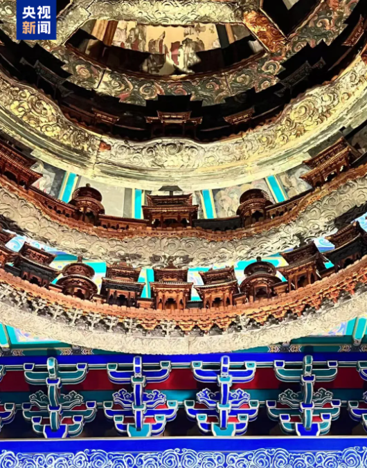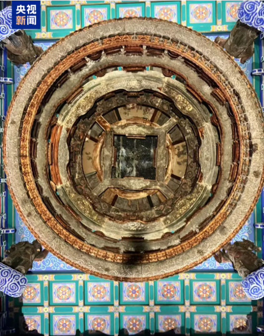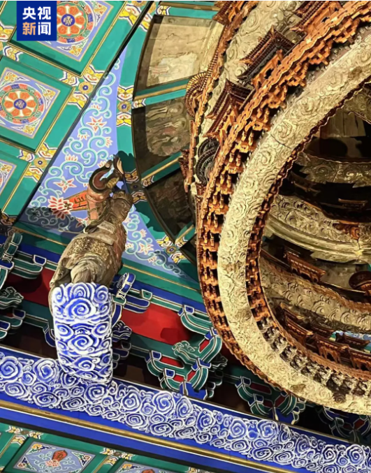 站在藻井下方抬头仰望,“四大天王”托起中心圆井,星图与藻井浑然一体,整座藻井方中有圆,圆中含方,展现着中国古人天圆地方的宇宙观。