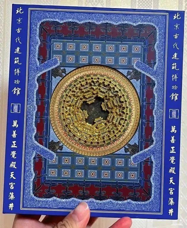这款冰箱贴的原型是北京古代建筑博物馆的“镇馆之宝”万善正觉殿天宫藻井。北京古代建筑博物馆位于先农坛内,而天宫藻井就位于先农坛太岁殿中,有“最美藻井”之称,也被网友称为“天花板中的天花板”。