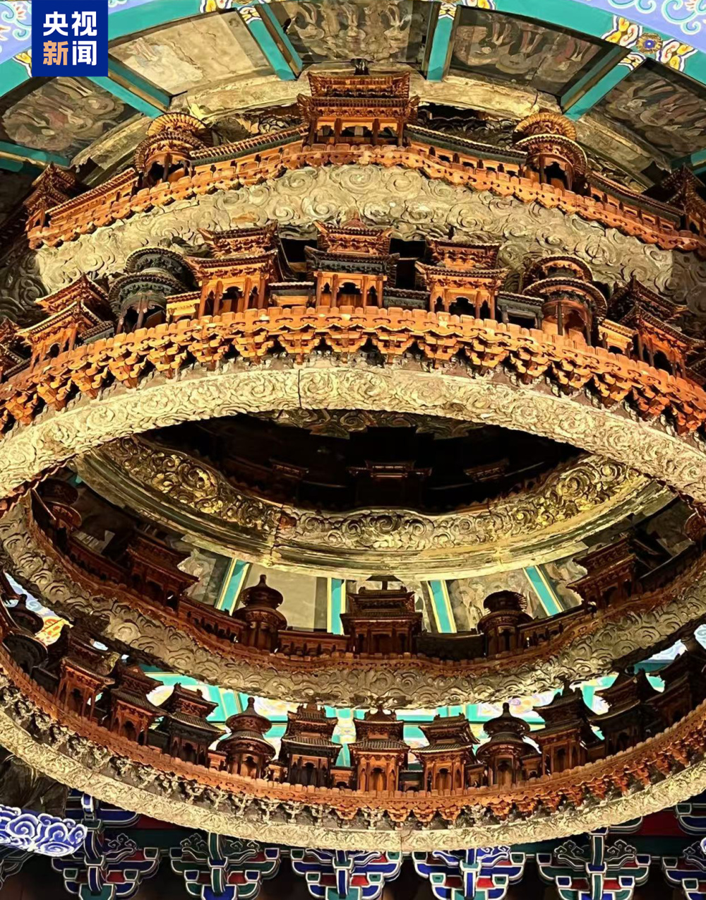 藻井整体金黄色,自上而下共六层,每层框架刻有精美云纹,云纹托架上,有数量不等的建筑模型,形态各异,用游廊相连接,琼楼玉宇,精雕细琢。