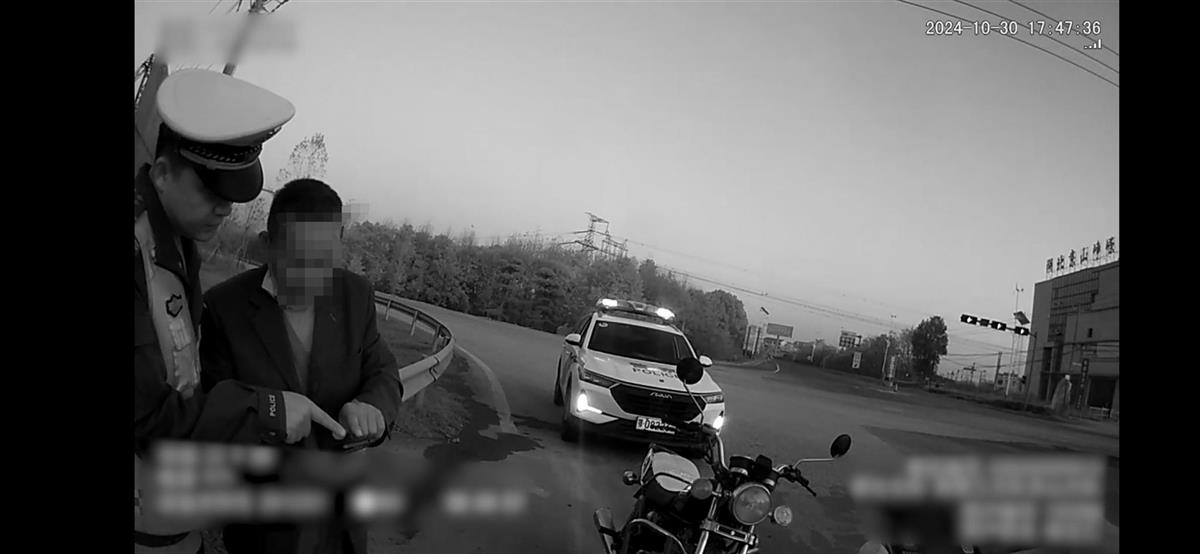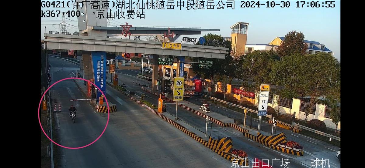 10月30日下午5时许,在许广高速京山收费站,一辆摩托车突然钻过收费站栏杆缝隙进入高速公路。收费站工作人员立即向高速公路监控中心报告。湖北高速交警京山大队民警立即开展查缉,发现该男子调了头,在超车道内逆行返回。在收费站,民警拦下这辆摩托车,询问骑车男子:“你要去哪里?为什么在高速公路上逆行?”