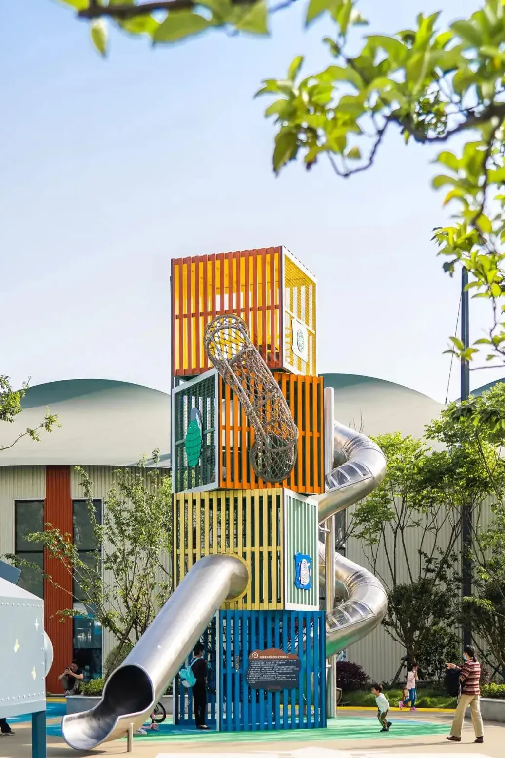 张之洞体育公园里,16个白秋千,围成一个大圈。儿童滑梯走“军事路线”,喷望塔、飞机、直升机、火箭轮番上阵,斑斓酷炫。此外,还有篮球、足球等7片运动场任选。