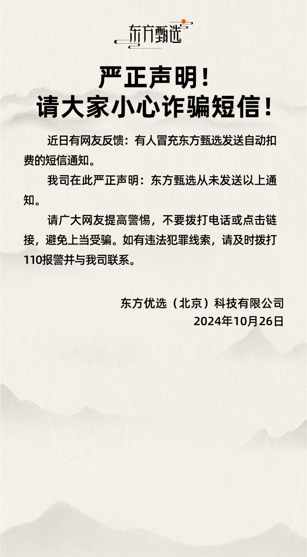 记者检索发现,今年10月26日,“东方甄选”官方微信公众号发布严正声明,称从未发送过自动扣费的通知。