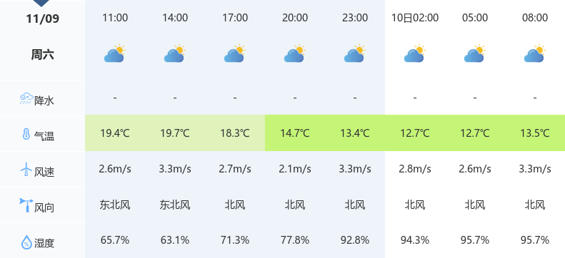 今天是2024年11月9日,武汉天气以多云为主,气温适宜,白天最高气温预计19℃,最低气温13℃,微风,空气湿度61%,体感温度18.8℃。建议市民朋友早晚温差较大,适时增减衣物,注意保暖。