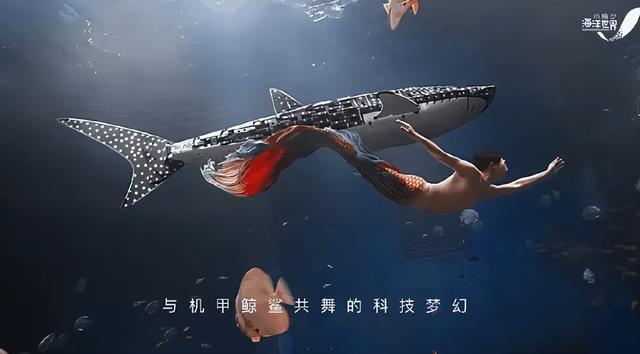 10月20日,记者在上海海昌海洋公园看到,馆内有两只人造鲸鲨,但并未游动,只是停靠在水面上方的一个角落里,待到当天人鱼表演时,一只人造鲸鲨才开始“游动”配合,能从外观直接看出“机械感”满满,整个游动过程较为平稳,并未展示出活体鲸鲨的动态。