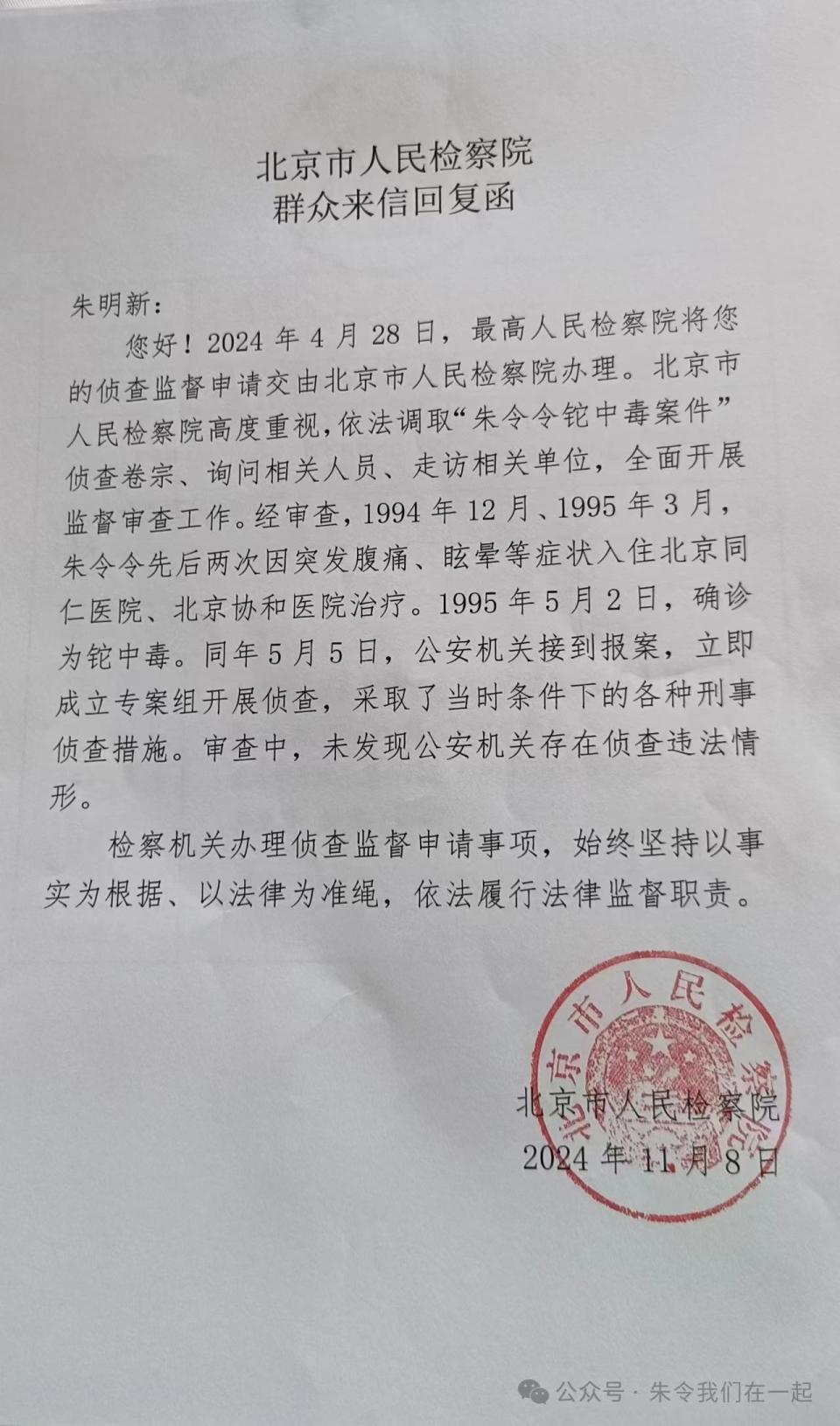 今年11月11日,朱令父母收到北京市人民检察院书面回复,内容如下:您好!2024年4月28日,最高人民检察院将您的侦查监督申请交由北京市人民检察院办理。北京市人民检察院高度重视,依法调取“朱令令铊中毒案件”侦查卷宗、询问相关人员、走访相关单位,全面开展监督审查工作。