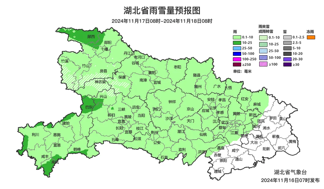 11月16日08时-17日08时,鄂西北、鄂西南阴天有小到中雨,局地大雨,其中鄂西北高海拔山区夜间有雨夹雪;其他地区阴天转小雨。最高气温西部15~19℃、东部20~25℃,最低气温鄂西北8~10℃、其他地区11~16℃,偏北风3到5级、阵风6到8级。