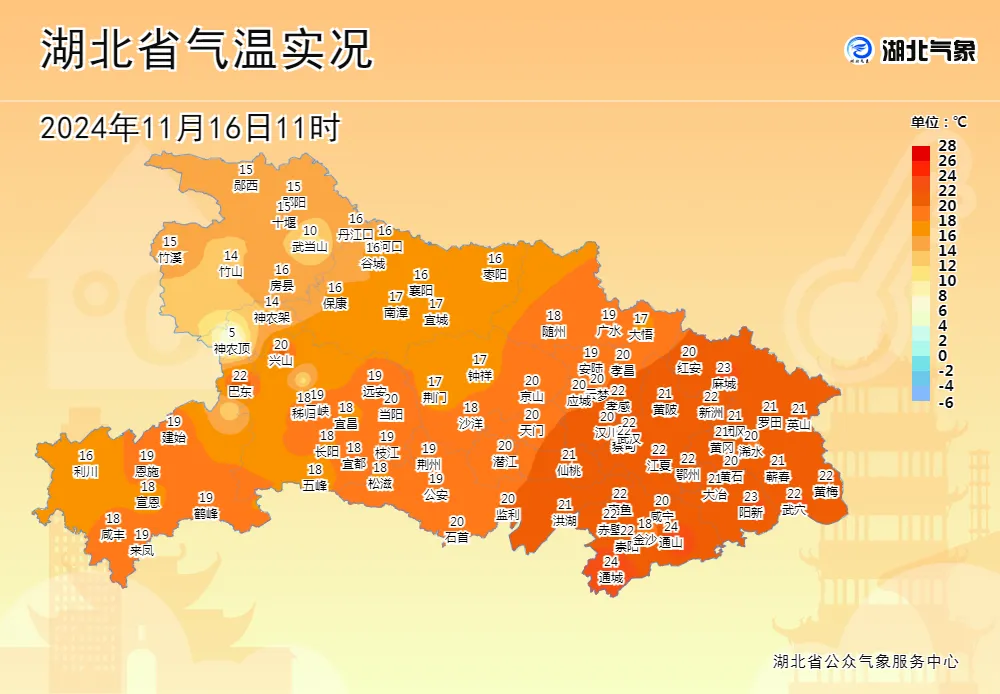 11月17日08时-18日08时,鄂西北、鄂西南阴天有小到中雨,其中鄂西北高海拔山区有雨夹雪或雪;其他地区阴天有小雨。最高气温鄂西北9~11℃、鄂东南14~17℃、其他地区11~14℃,最低气温西部6~9℃、东部9~13℃,偏北风3到5级、阵风6到8级。