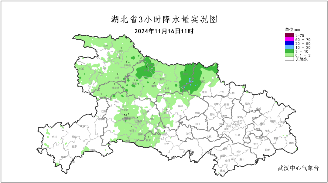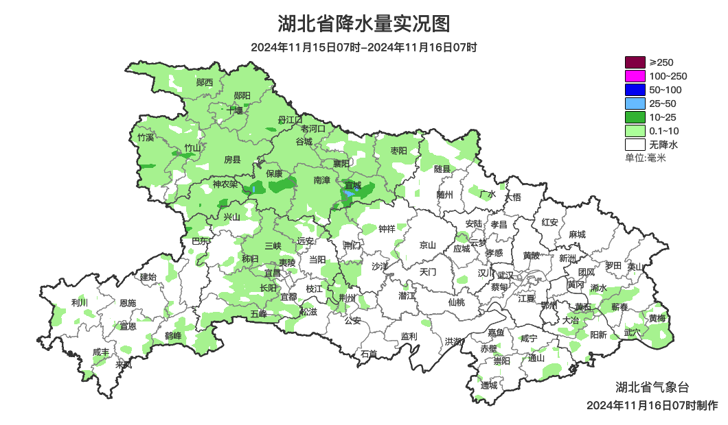 昨日(15日)07时至今日07时,鄂西和黄冈、黄石、咸宁部分地区出现小雨,其中鄂西北局地中雨、单点大雨,雨量最大为宜城鄢城街道31.9毫米;其他地区多云到阴天。
