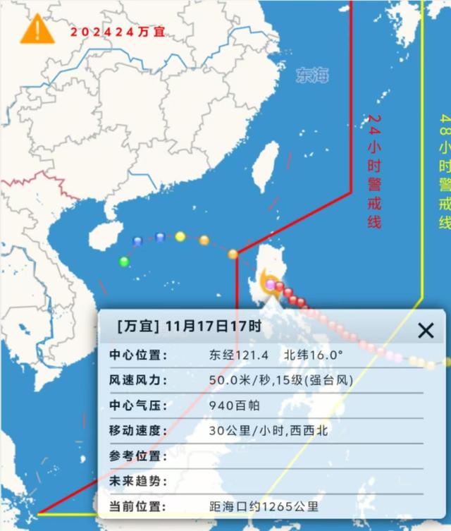今年第24号台风“万宜”(超强台风级)的中心已于17日15时前后在菲律宾吕宋岛东部奥罗拉省沿海登陆,登陆时中心附近最大风力有17级(58米/秒)。预计,“万宜”将以每小时25—30公里的速度向西北方向移动,之后穿过吕宋岛于17日夜间至18日凌晨进入南海东部海面,20日趋近海南岛东部海面,强度逐渐减弱。