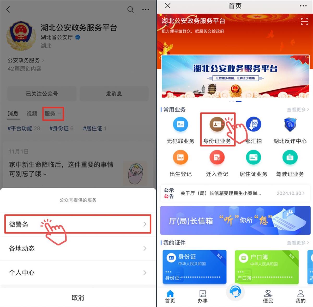 目前,该事项可在微信端和支付宝端办理。微信端,通过湖北公安政务服务平台公众号,选择“服务”菜单,点击“微警务”,进入办事平台;进入平台首页,点击“身份证业务”按钮,找到这一事项后,按指引操作即可。