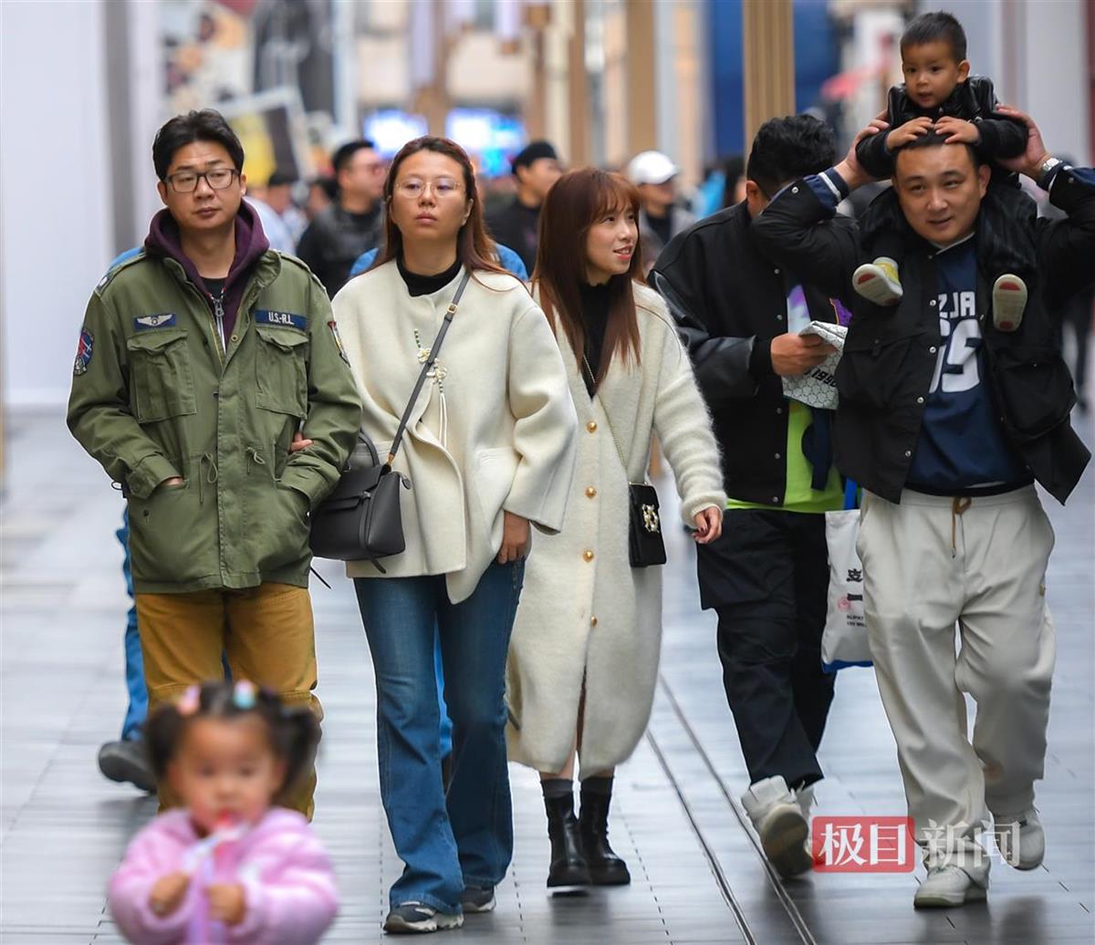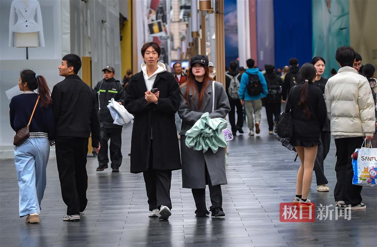 11月17日,武汉市迎来了一股强冷空气的侵袭,气温骤降,一夜之间进入了冬季。在武昌汉街,寒风凛冽,市民和游客纷纷裹上厚重的冬装外套,顶风前行,抵御着突如其来的寒冷。