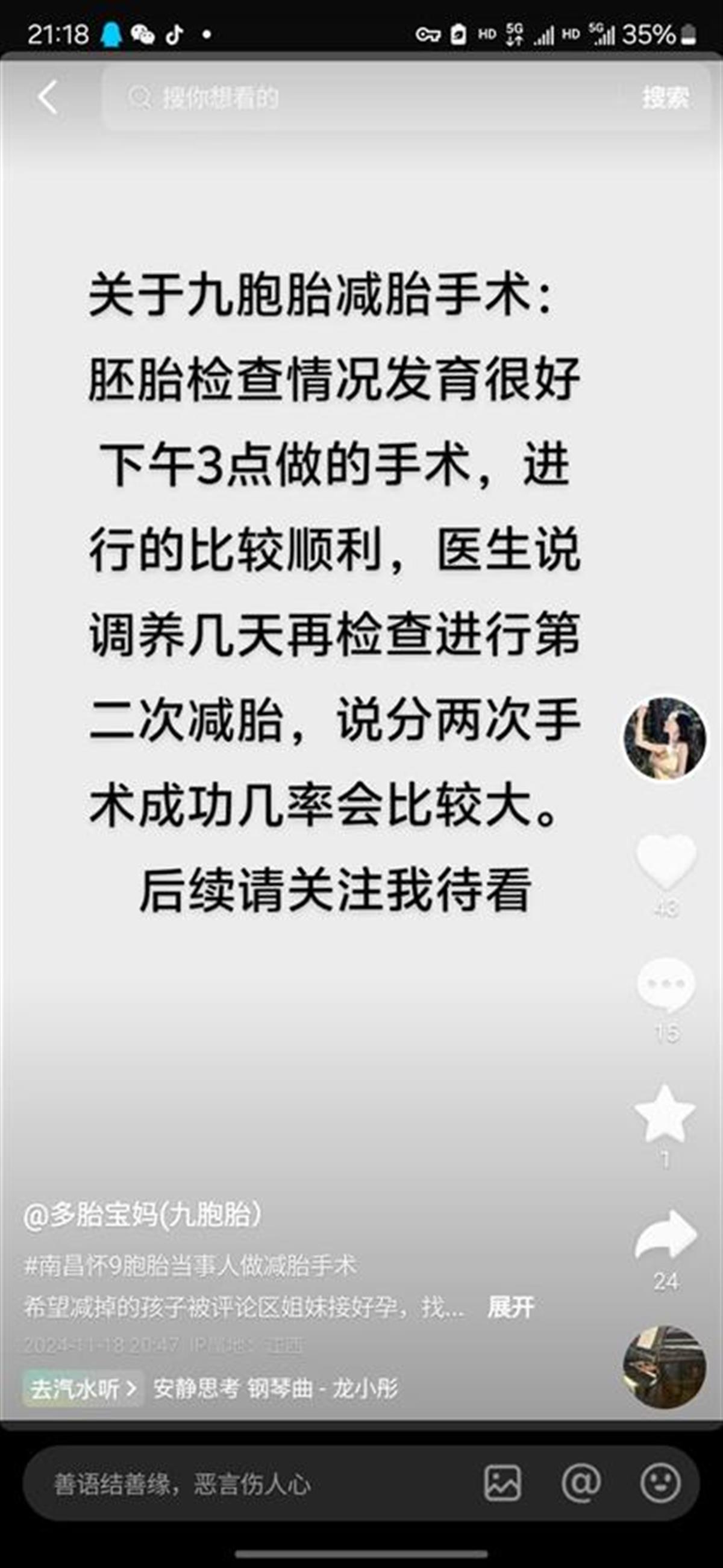 11月18日晚,江西南昌怀上九胞胎的女子在社交平台更新状态,向关心她的广大网友报平安。