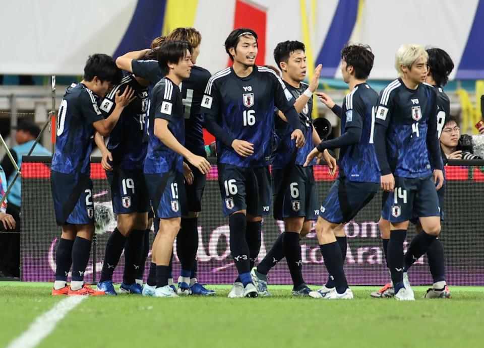 11月19日,日本队球员庆祝进球。新华社记者 贾浩成 摄