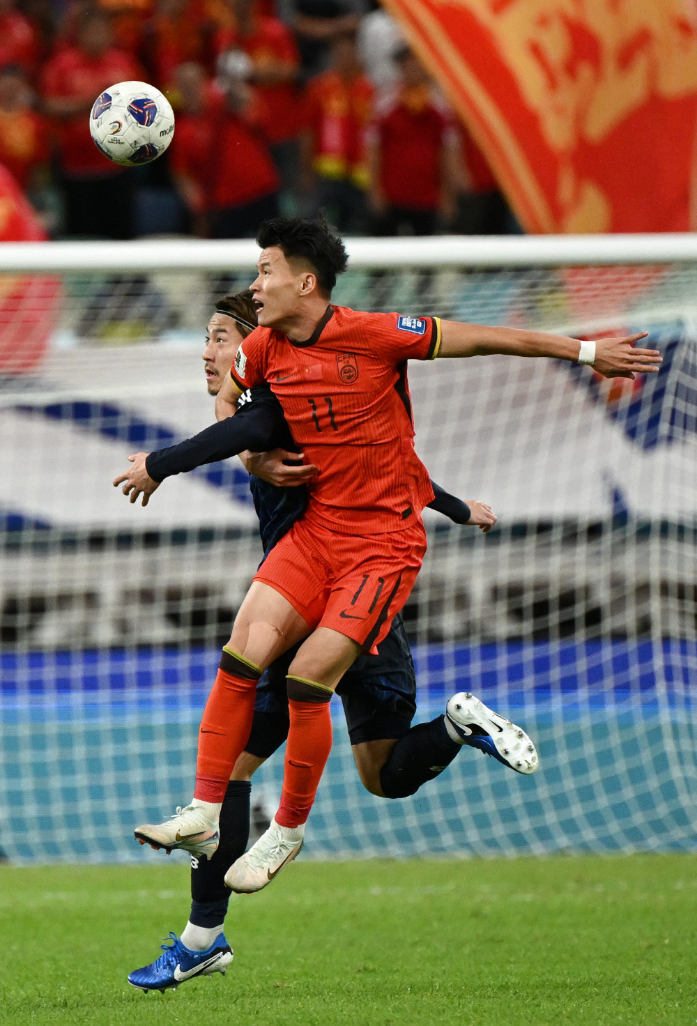 11月19日,中国队球员林良铭(右)与日本队球员濑古步梦拼抢。新华社记者 魏培全 摄