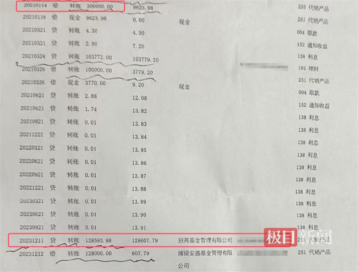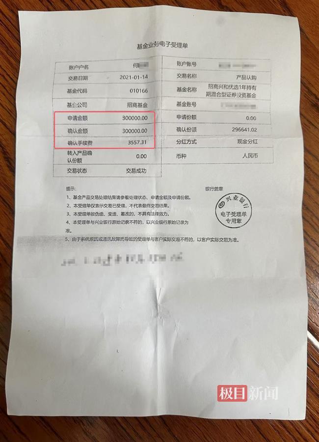 事情还要从三年前说起。何女士告诉极目新闻记者,2021年1月,她时年71岁的父亲何中(化名),原计划将积攒多年的30万元在兴业银行武汉分行营业部办理大额定期存款,可在客户经理龙某的介绍下,全部买成了一只证券投资基金,截至目前,亏损近17万元。