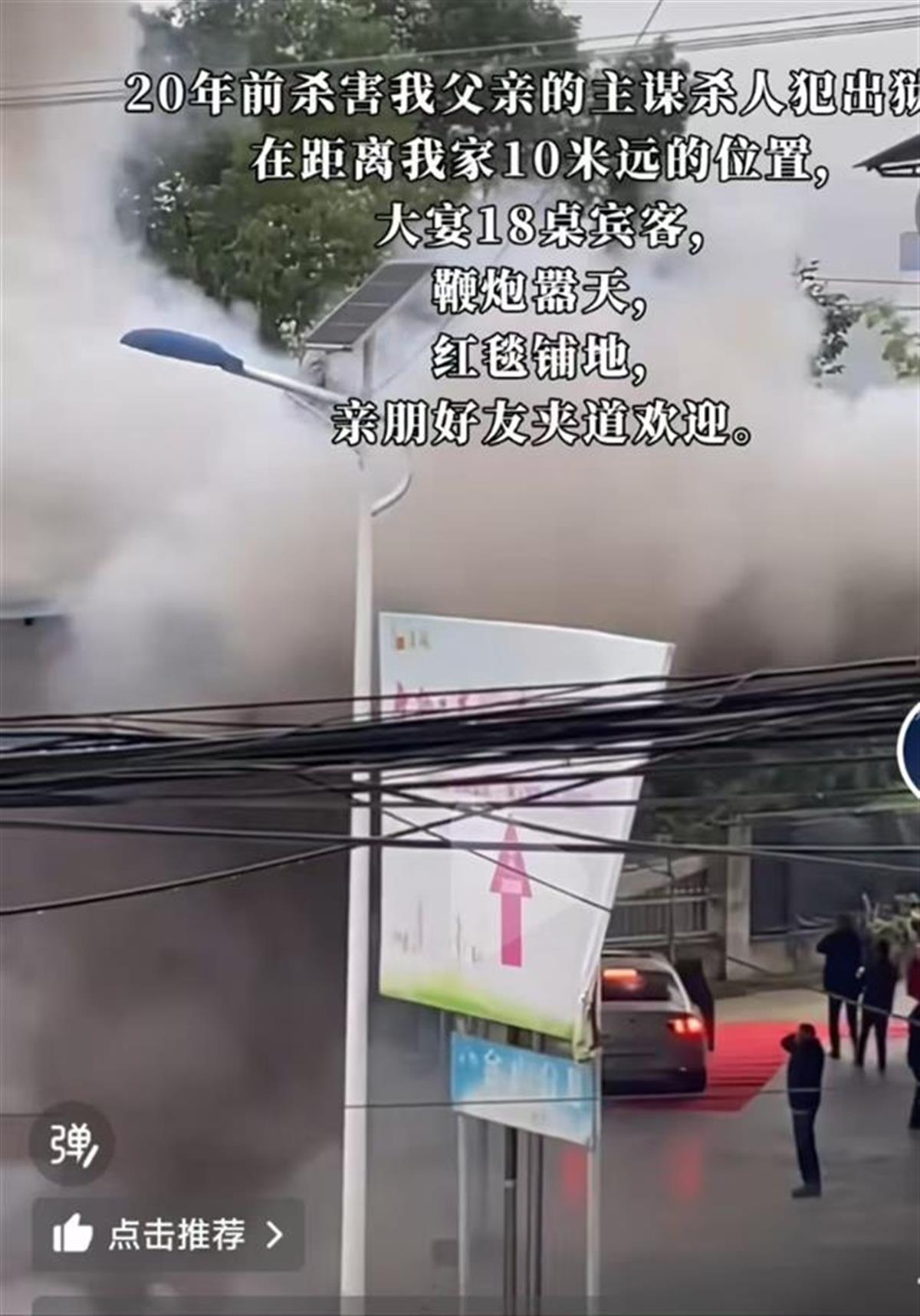 11月15日,受害人家属李某发视频称,“20年前杀害我父亲的主谋出狱,在距离我家10米远的位置,大宴18桌宾客,鞭炮喧天,红毯铺地,亲朋好友夹道欢迎。”李某后续在视频中透露,自己15岁时,自家亲戚和自家邻居发生争吵,父亲帮衬亲戚,被怀恨在心的邻居雇凶杀害。案发后,邻居被判有期徒刑,前段时间刑满20年出狱。