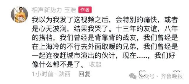 在视频评论区,张玉浩还写到:我以为我发了这视频之后,会特别的痛快,或者是心无波澜,结果我哭了。十三年的友谊,八年的搭档,我们曾经是背靠背的战友,我们曾经是在上海冷得不行去外面取暖的兄弟,我们曾经是一起连夜赶城市演出的伙计,现在......,我们好像什么都不是了。