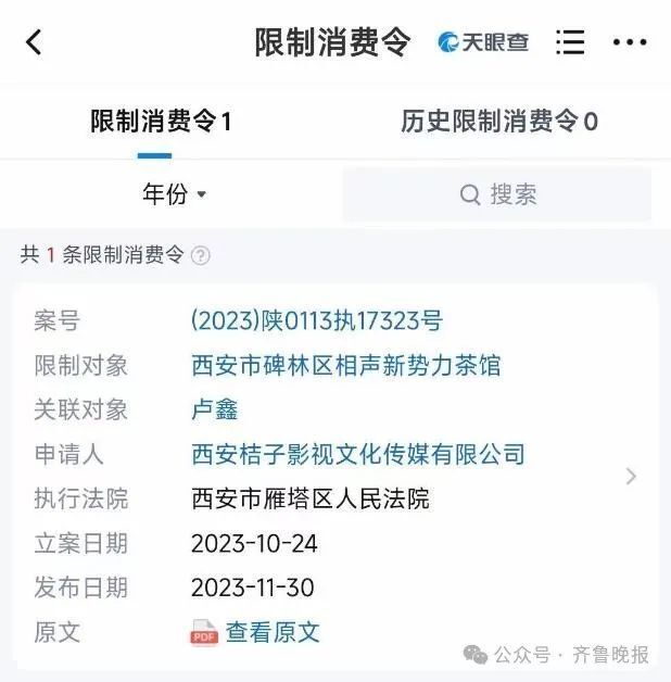 据企查查,西安卢鑫玉浩文化传媒有限公司法人卢鑫已被限制高消费,限高令申请人为西安桔子影视文化传媒有限公司。