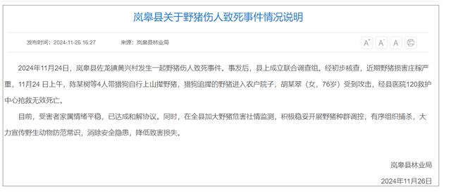 当天,岚皋县发布关于野猪伤人致死事件情况说明。说明称,事发后,当地成立联合调查组。经初步核查,近期野猪损害庄稼严重,11月24日上午,陈某树等4人带猎狗自行上山撵野猪,猎狗追撵的野猪进入农户院子,胡某翠(女,76岁)受到攻击,经县医院120救护中心抢救无效死亡。