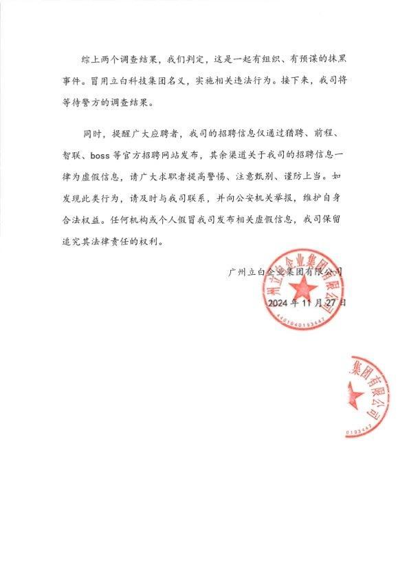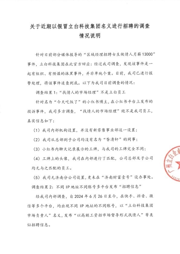 立白科技集团官博发布关于近期以假冒立白科技集团名义进行招聘的调查情况说明,内容如下: