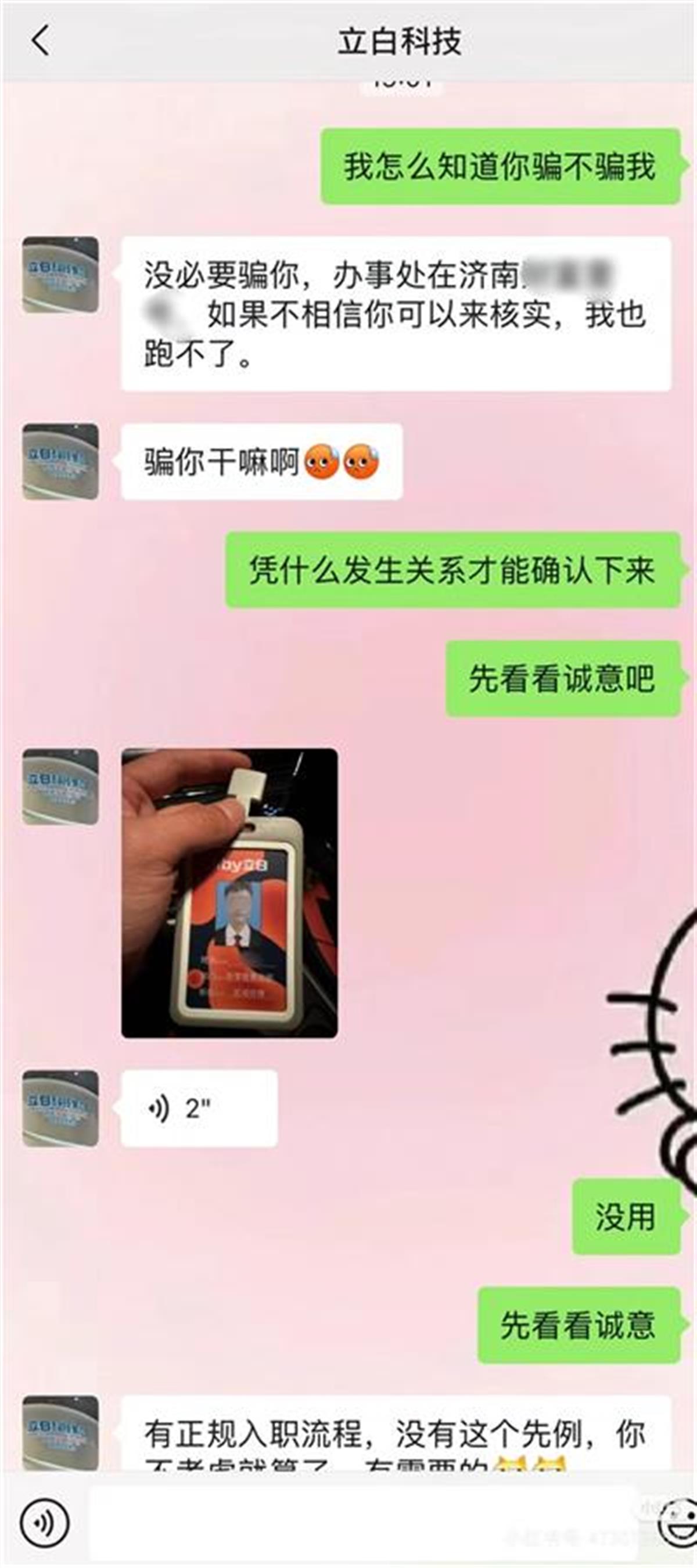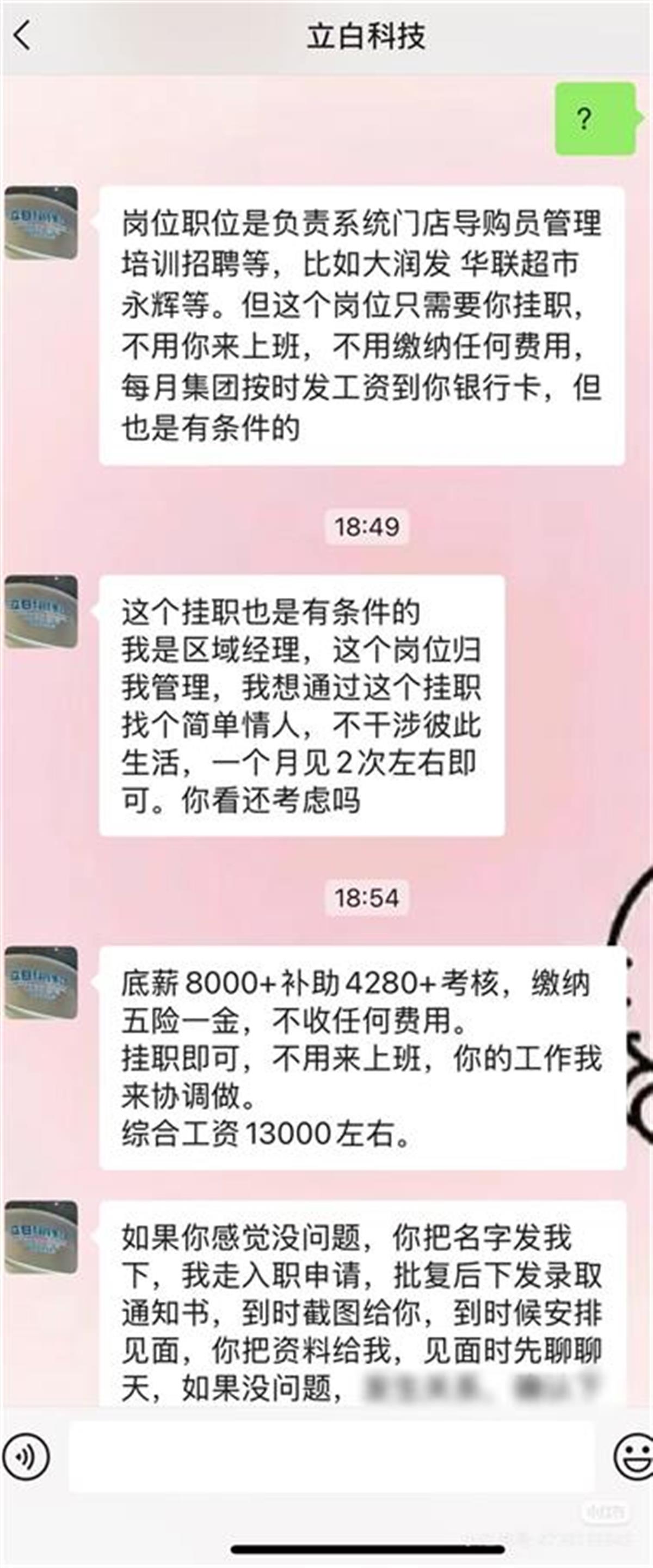 发帖人发布的聊天记录截图显示,头像为立白科技集团标识的一账号称,岗位负责系统门店导购员管理、培训招聘等,但只需要挂职,不用上班,也不用缴纳任何费用,每月集团按时发工资,底薪8000元,加上4280元补助及考核,综合工资有1.3万元左右。得到这份工作的条件是成为不干涉彼此生活的情人。在被质疑后,该账号称办事处在山东济南一地址,还提供了带有立白标识的工作证,称有正规入职流程。证件图片显示,该人员所在的部门是新零售事业部,职位是区域经理。