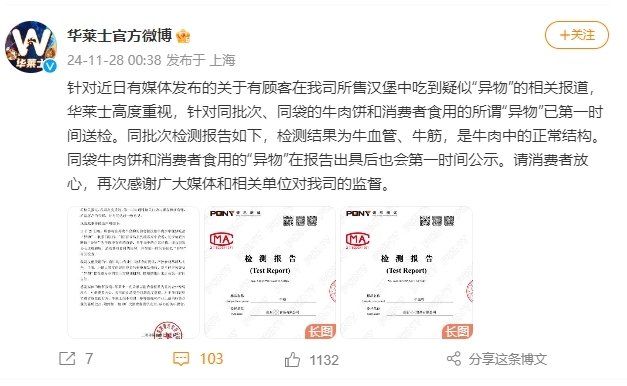 新京报讯11月28日,华莱士官方微博发文称:针对近日有媒体发布的关于有顾客在我司所售汉堡中吃到疑似“异物”的相关报道,华莱士高度重视,针对同批次、同袋的牛肉饼和消费者食用的所谓“异物”已第一时间送检。同批次检测报告如下,检测结果为牛血管、牛筋,是牛肉中的正常结构。