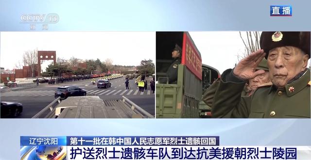 山河同念,英雄回家。今天上午,第十一批43位在韩中国人民志愿军烈士遗骸及其相关遗物,由中国空军运-20运输机运送,回归祖国怀抱,沈阳桃仙国际机场以“过水门”的最高礼遇,为43名中国人民志愿军英烈洗去征尘。在迎回仪式结束之后,护送第十一批在韩中国人民志愿军烈士遗骸的车队从机场出发,途经沈阳主城区,抵达沈阳抗美援朝烈士陵园。
