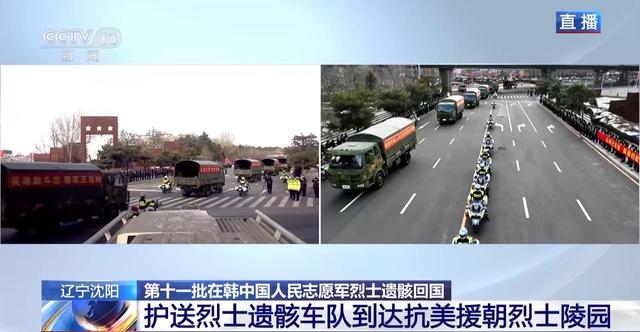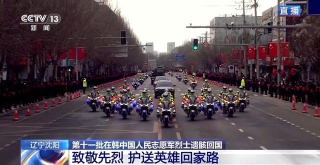 护送着第十一批43位在韩中国人民志愿军烈士遗骸及其相关遗物的车队,途经浑河大桥、沈阳科学宫、人民广场、北陵公园等重要点位,最后到达沈阳抗美援朝烈士陵园。
