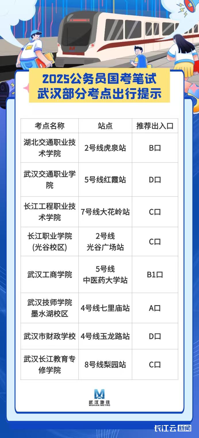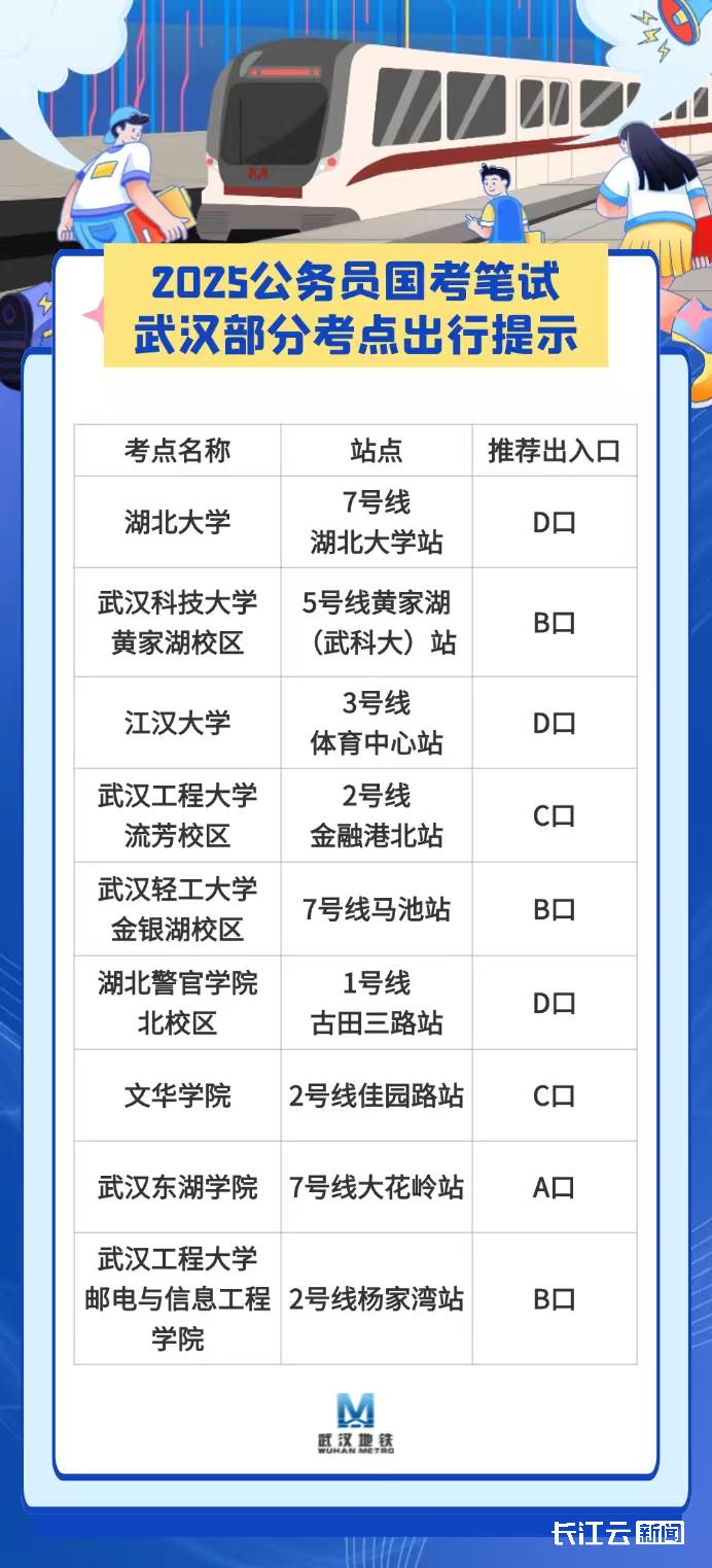 2025年度国家公务员考试将于11月30日、12月1日举行。长江云新闻记者从武汉地铁运营公司获悉,今年国考武汉共设32个考点,其中湖北大学、武汉科技大学黄家湖校区等17个考点邻近地铁站,分布在武汉地铁1、2、3、4、5、7、8号线沿线,出站后步行可到达考点。武汉地铁提醒各位考生,在熟悉考点的同时,要掌握乘车路线、路途用时,合理规划好出行时间;到站台候车时,一定要看清列车运行方向再上车;出站时可选择距离考点较近的出入口,如需帮助,可及时联系身边工作人员或拨打服务热线027-96556。