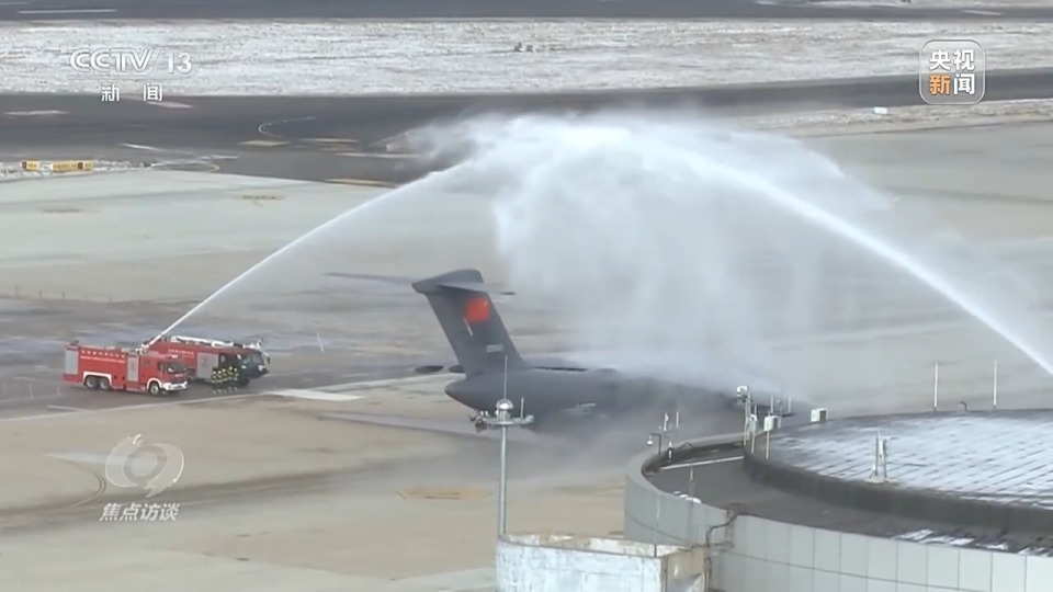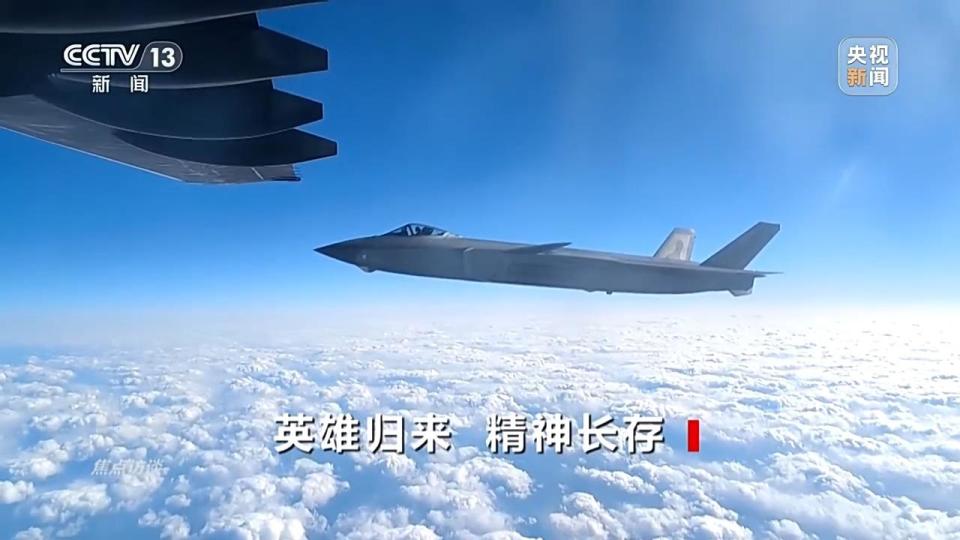 飞行回国途中,两架振翅长空的歼-20战机与运-20组成三机编队,以空军独有的礼仪迎接志愿军烈士的英灵回家。沈阳桃仙国际机场以航空最高礼仪为中国人民志愿军烈士“接风洗尘”。