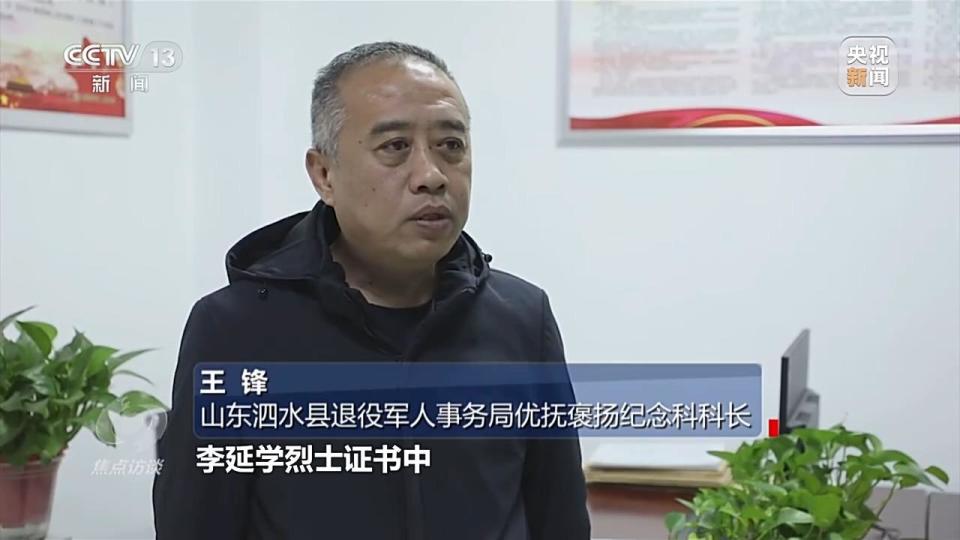 山东泗水县退役军人事务局优抚褒扬纪念科科长 王锋:经调查,在李姓家族中,“常”和“延”为同辈不同字的用法。在老人保存的李延学烈士证明书中,我们发现李常学烈士与李延学烈士的牺牲时间和出生时间是一致的,我们就基本确认李常学烈士和李延学烈士是同一人,我们将相关情况及时向上级汇报。
