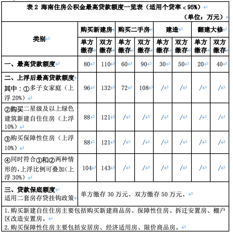 上浮了借款人家庭在海南省购买二星级及以上绿色建筑项目新建自住住房的最高贷款额度。调整前:无上浮政策。调整后:上浮10%。上浮后单方最高88万元,双方最高121万元。