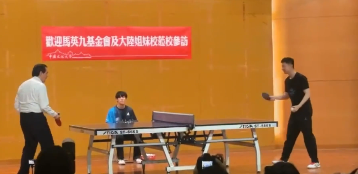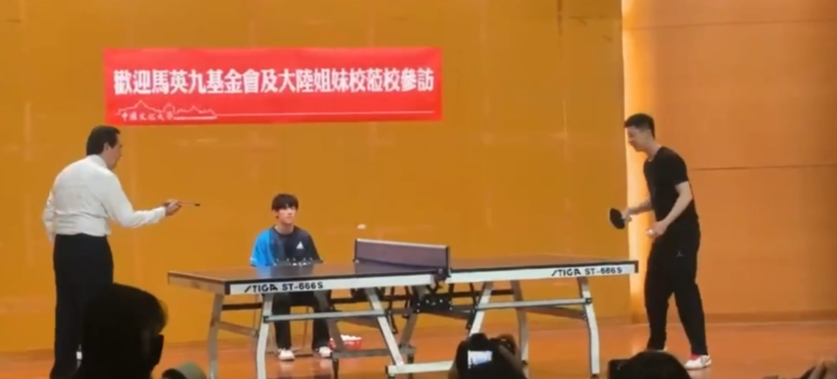 11月29日下午,大陆高校师生访问团到“中国文化大学”参访。访问团成员、乒乓球世界冠军马龙与“中国文化大学”校友、台湾乒乓球运动员陈思羽、蒋澎龙举行友谊比赛,切磋球技。