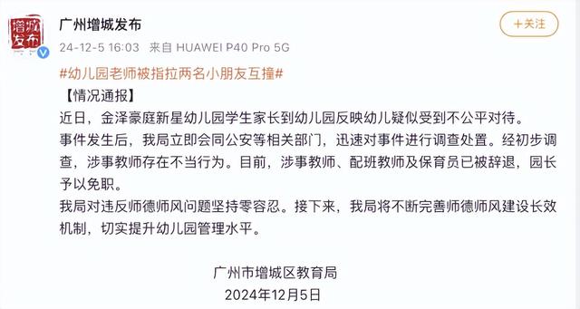 12月5日,广东省广州市增城区教育局通报: