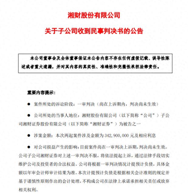 湘财证券表示,公司所涉案件尚在一审判决上诉期,判决尚未生效,且公司对上述一审判决不服,将依法提起上诉,通过法律手段切实维护公司及投资者的合法权益。