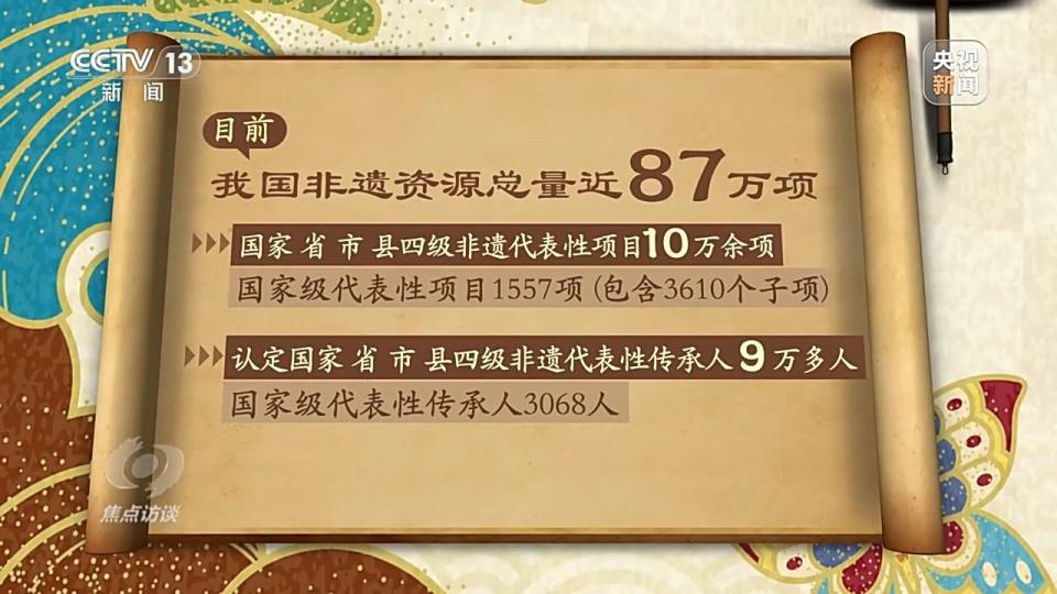 目前,我国非遗资源总量近87万项,国家、省、市、县四级非遗代表性项目10万余项,其中国家级代表性项目1557项(包含3610个子项)。认定国家、省、市、县四级非遗代表性传承人9万多人,其中国家级代表性传承人3068人。