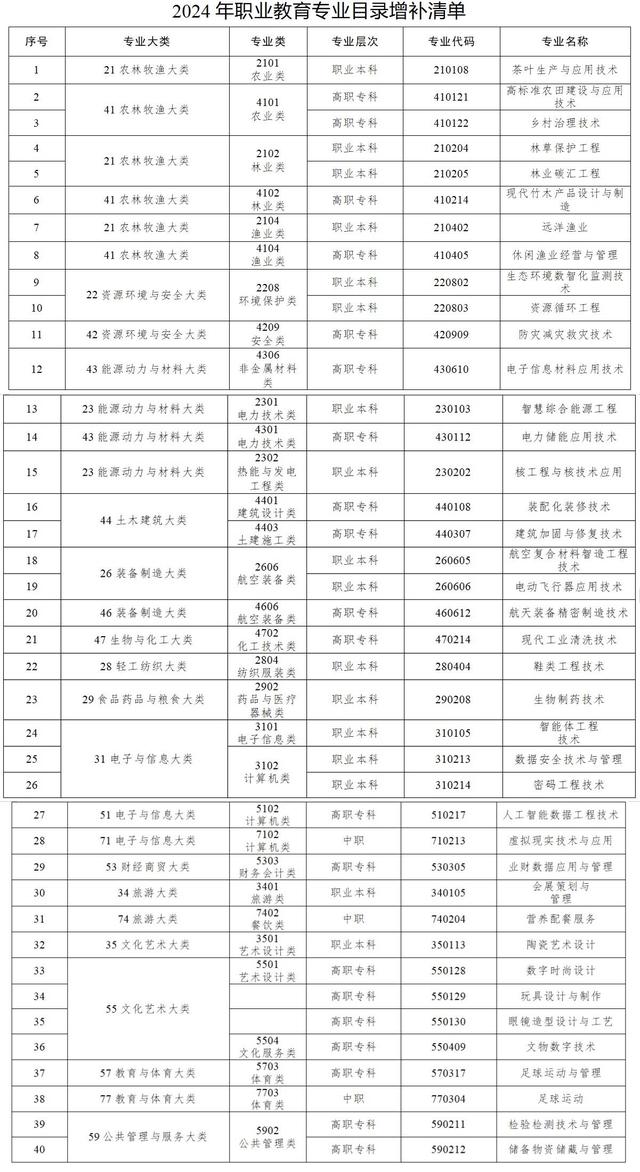今天,教育部更新发布了《职业教育专业目录》,共增设40个新专业,其中,中职专业3个、高职专科专业20个、职业本科专业17个,增设数量是自2021年新版《职业教育专业目录》发布以来最多的一年。