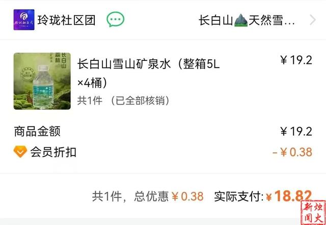 张女士告诉记者,11月17日,她看到有团购“长白山雪山矿泉水”的信息,整箱是4桶水,共18.82元,她便直接下单购买了。