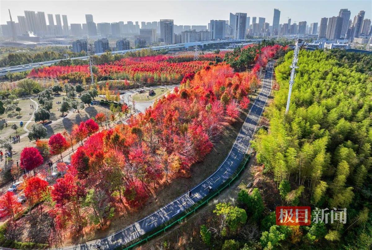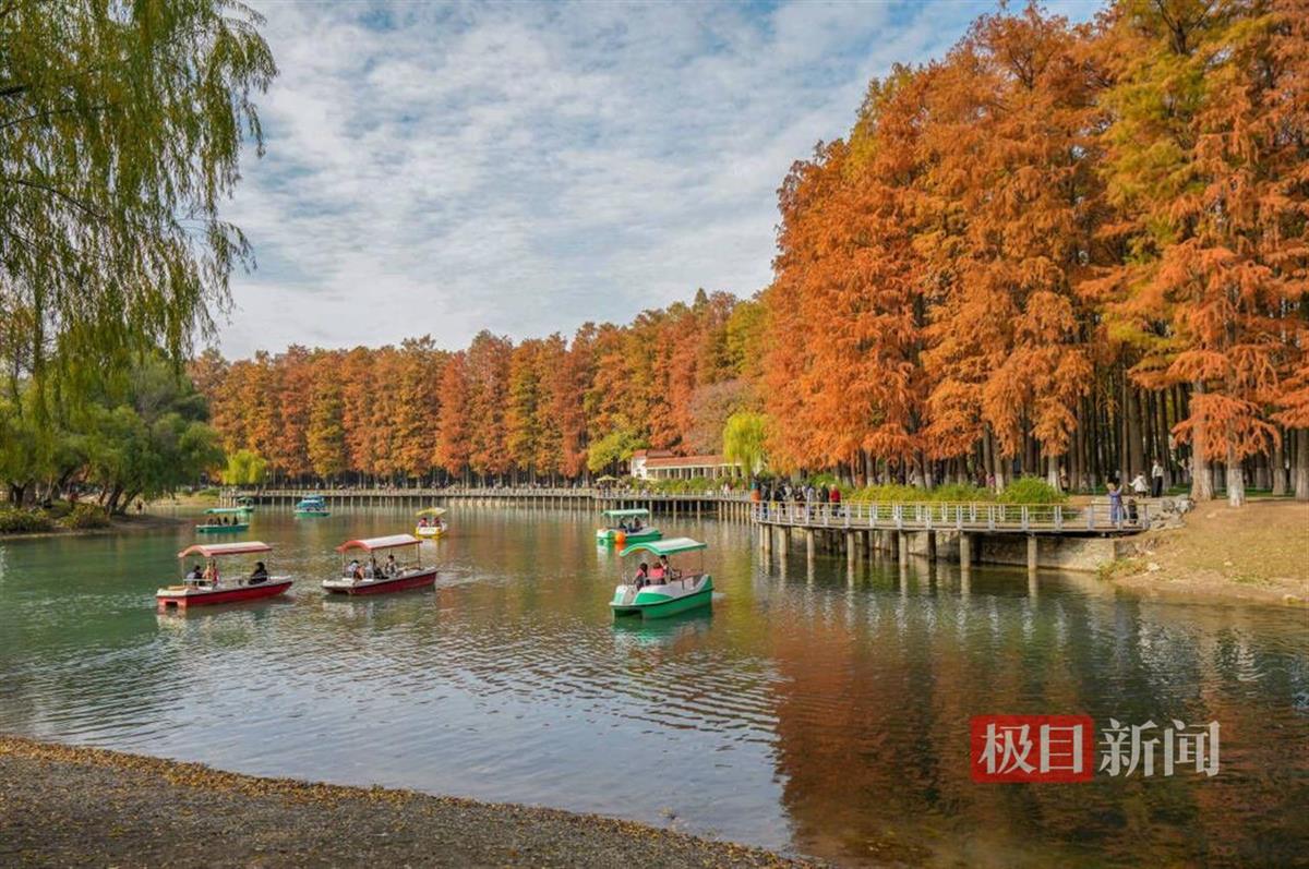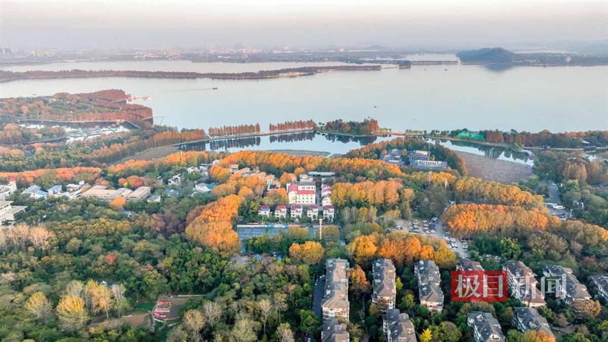 红艳艳的“枫”景在路上、公园里、江湖畔,金灿灿的银杏绘就一条条黄金大道,深咖色的池杉林与湖塘之水相映成趣,橙红的樱花树叶片在风中摇曳……