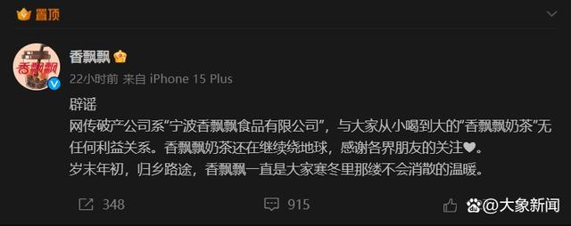 12月15日晚,A股“奶茶第一股”香飘飘官方微博辟谣称,网传破产公司系“宁波香飘飘食品有限公司”,与大家从小喝到大的“香飘飘奶茶”无任何利益关系。