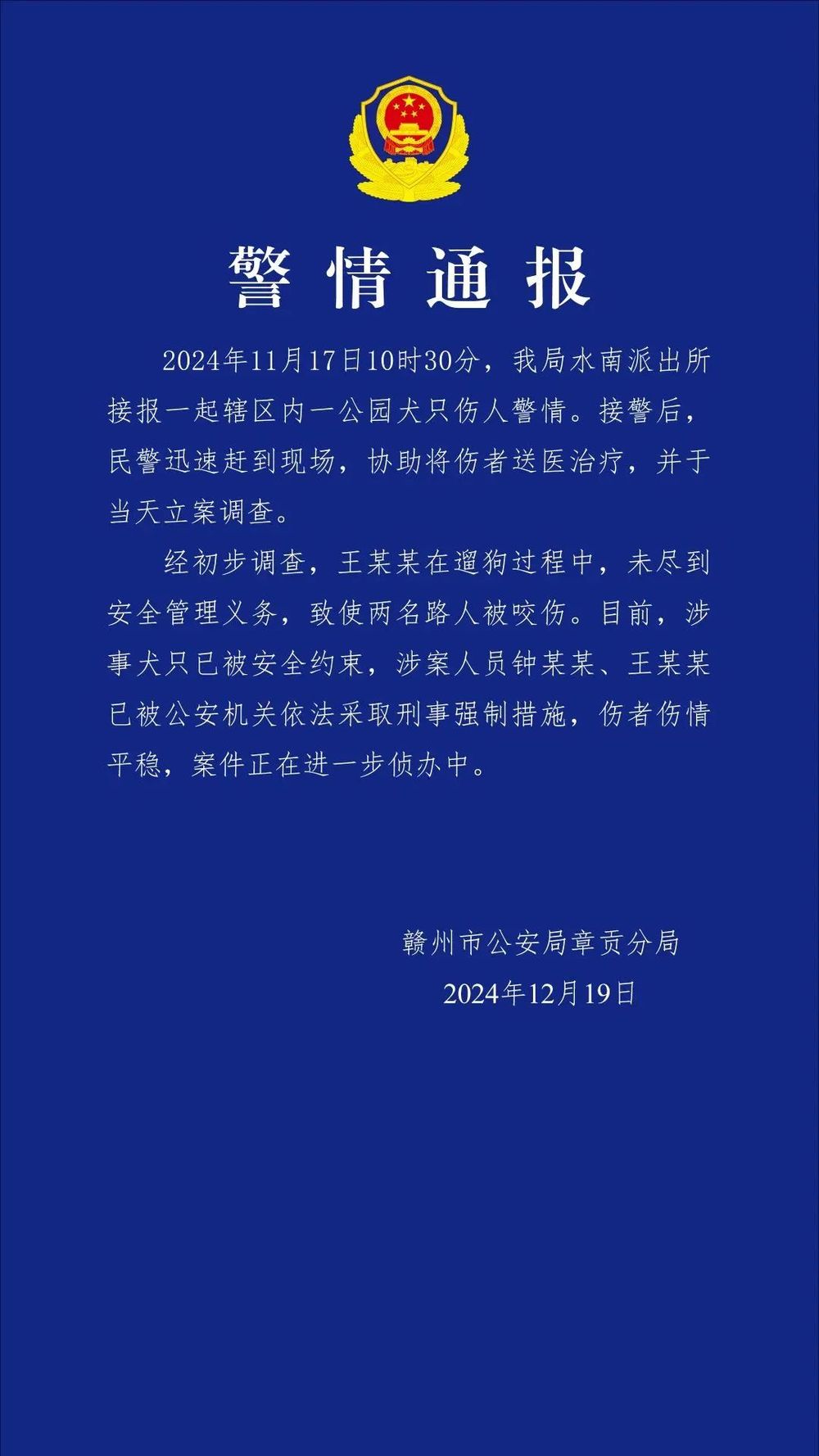 目前,涉事犬只已被安全约束,涉案人员钟某某、王某某已被公安机关依法采取刑事强制措施,伤者伤情平稳,案件正在进一步侦办中。